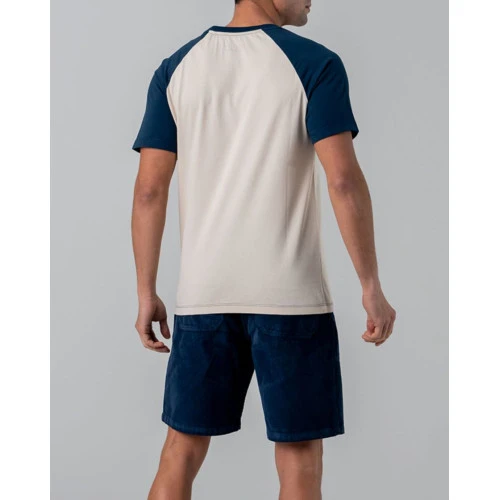 A colour blocked t-shirt with raglan sleeves. Front vintage screen print and finished with ribbed collar.